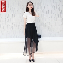 不规则网纱半身裙女夏雪纺时尚荷叶边中长款黑色显瘦透视A字裙子