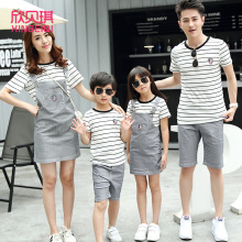 亲子装夏装2016新款一家三口家庭装母子短袖条纹全家套装母女裙