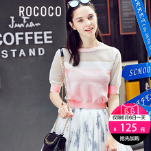 洛可可2017春装新款网纱拼接彩色条纹五分袖薄针织圆领T恤套衫女