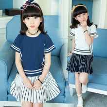 2017夏装新款女童短袖套装学院风短袖T恤上衣条纹裙两件女孩衣服