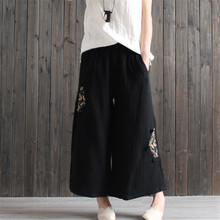 文文女装 2017新复古文艺棉麻松紧腰盘扣刺绣大版民族风阔腿裤Y11