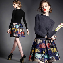 艾丹戴维斯新品秋装长袖印花打底裙针织拼接修身A字女印花连衣裙