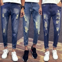 男士牛仔裤春夏款青少年修身型小脚裤s破洞九分牛子裤男生裤子男