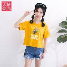 2017韩版女装夏装新款姜黄色T恤女生甜美学院风宽松短款短袖上衣
