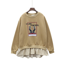 韩国宽松大码中长款下摆开叉卷边袖印花网纱拼接假两件长袖T恤 女
