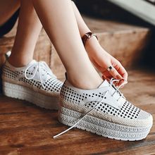 夏季松糕底单鞋百搭镂空小白鞋真皮透气网鞋洞洞系带厚底女鞋白色