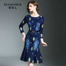 2017夏装新款女装长袖修身显瘦鱼尾裙包臀中长款时尚牛仔连衣裙子