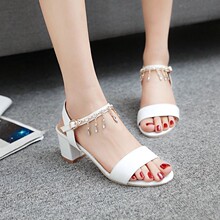 2017夏季新款波西米亚流苏串珠粗跟露趾凉鞋一字扣带高跟甜美女鞋