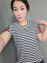 玫瑰花刺绣斑马条纹T恤女短袖夏季2017修身大码半袖简单黑白上衣