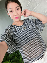 喇叭袖雪纺衫黑白小格子上衣女夏薄款透视五分袖夏季宽松大码小衫