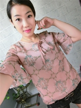 喇叭袖系带雪纺衫女2017夏季淑女短袖宽松显瘦碎花打底衫小衫上衣
