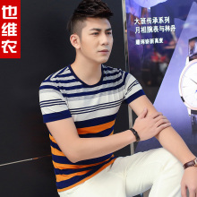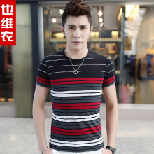 也维农夏季男士短袖t恤男 圆领 条纹上衣韩版修身半袖体恤男