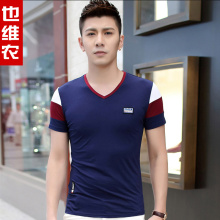 也维农夏季男士短袖T恤V领修身韩版男式半袖上衣撞色打底衫