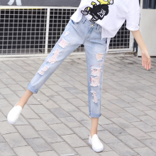 春夏新款破洞牛仔裤女9分裤宽松显瘦bf哈伦裤修身直筒九分裤