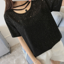【小乐家】2017夏装新款时尚亮丝镂空纯色短袖上衣女士套头T恤