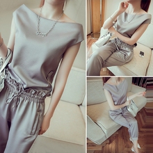 【小乐家】夏季新款显瘦时尚气质两件套女士一字领上衣九分裤套装