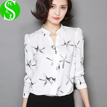 2017春季新款韩版修身百搭衬衣女长袖印花雪纺衫上衣V领打底衫潮