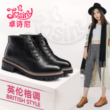 卓诗尼2016新款短靴女 英伦风秋冬系带黑色平底休闲鞋 及裸靴中跟