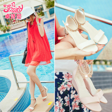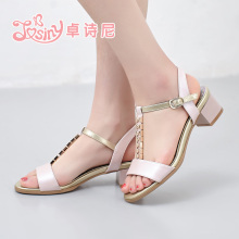 卓诗尼粗跟凉鞋女夏2017新款一字扣带百搭高跟露趾罗马时尚女鞋