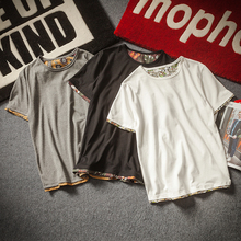 夏季日系碎花拼接假两件短袖t恤男士韩版加大码半袖青年休闲体恤