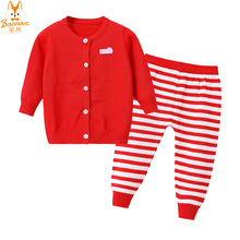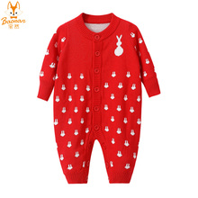 宝然婴儿衣服毛衣连体衣宝宝春装哈衣爬服针织衫开衫纯棉红色6507