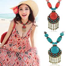 包邮波西米亚项链沙滩配饰海滩度假民族风纯手工复古绿松石毛衣链