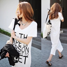 英文字母韩版夏宽松大码v领白色开叉短袖学生超长款T恤女裙过膝潮