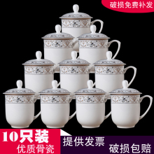 景德镇 茶杯陶瓷带盖 办公室会议室茶杯骨瓷带盖中南海盖杯10只