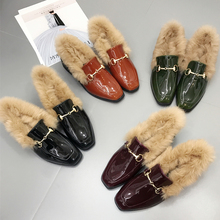 秋冬韩版懒人棉鞋女加绒漆皮保暖乐福鞋平底兔毛鞋方头瓢鞋毛毛鞋