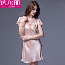 达尔丽2017家居服桑蚕丝蝴蝶结夏薄款V领短袖女士真丝睡裙W242120