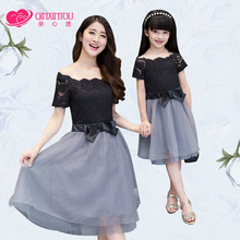 亲子装夏装2016韩版母女装连衣裙修身公主裙一字领露肩蕾丝纱裙子