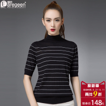 2017春装新款女装薄款半高领毛衣气质中袖针织衫显瘦条纹打底衫女