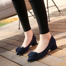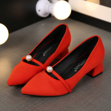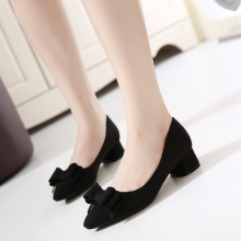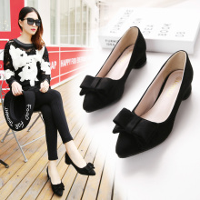 秋季粗跟尖头中跟单鞋浅口高跟鞋黑色职业鞋红色婚鞋蝴蝶结工作鞋