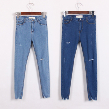 韩版firefly膝盖破洞裤脚留须高腰牛仔小脚裤女长裤铅笔裤显瘦潮