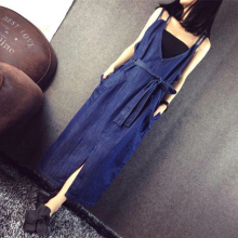 加肥超大码女装胖mm2016夏装中长款牛仔裙背心裙V领连衣裙200斤