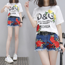 大码女装胖mm夏装2017新款套装微胖妹妹宽松t恤牛仔短裤两件套潮
