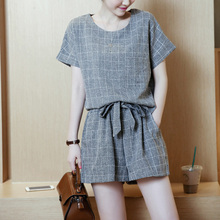 2017大码女装胖mm休闲套装微胖妹妹夏装新款格子上衣热裤两件套潮