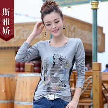 斯雅娇2017春装新款水墨印花打底衫韩版大码女装长袖上衣女士t恤