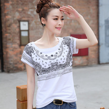 2017新款夏装韩版女装民族风短袖t恤美女头像印花大码棉体恤上衣