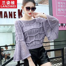 兰姿维2017春季新款女韩版时尚喇叭袖长袖一字领宽松蝙蝠衫毛衣女