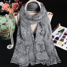 2017韩国精致绣花真丝围巾女性柔美桑蚕丝巾春秋夏刺绣披肩深灰色