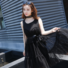 无袖黑色连衣裙中长款2017新款韩版夏季宽松女装蕾丝网纱学生裙子