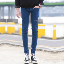 青少年韩版男生膝盖破洞小脚裤长裤潮流百搭蓝色韩版修身牛仔裤男