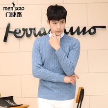 门捷路春秋新款纯色男士麻花针织衫青年羊毛衫修身圆领毛衣