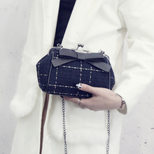 森女蝴蝶结毛呢夹扣单肩包2017春新款文艺条纹女包日系复古斜挎包
