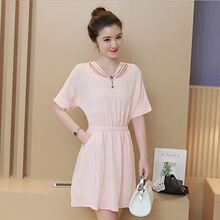 夏季韩版新款女装圆领套头短袖松紧腰连衣裙