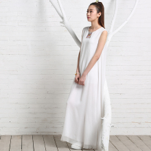 夏季新品民族风无袖真丝皱刺绣百搭长裙 白色显瘦吊带挂脖连衣裙