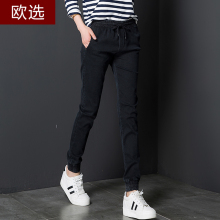 春秋2016新款黑色牛仔裤女长裤子松紧腰系带收口小脚宽松哈伦裤潮