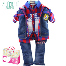 2017春秋装宝宝套装男童秋装格子牛仔三件套0-1-2-3岁小孩子衣服
