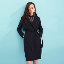 裙纪春季新款欧美风衣OL黑色系带中长款西装领简约修身显瘦外套女
